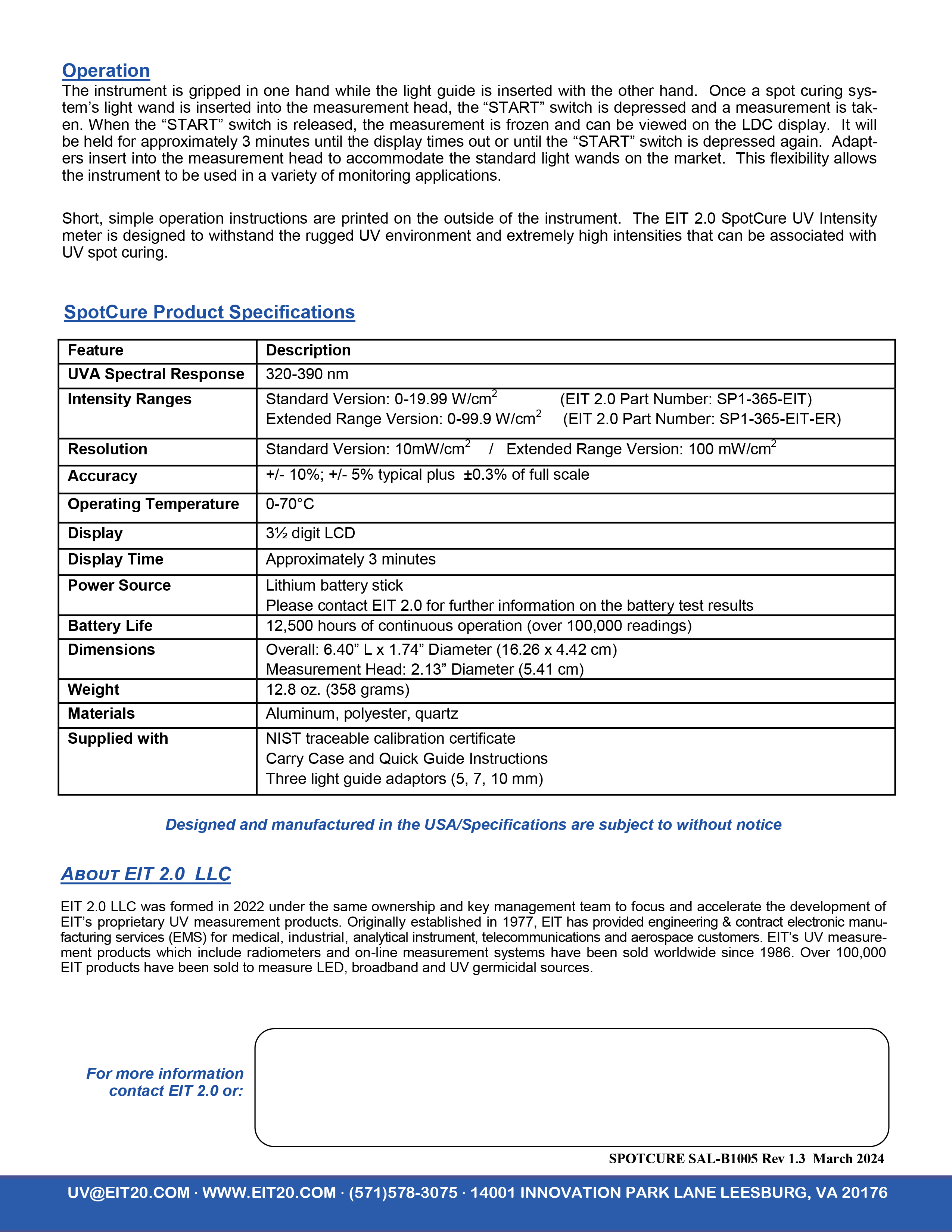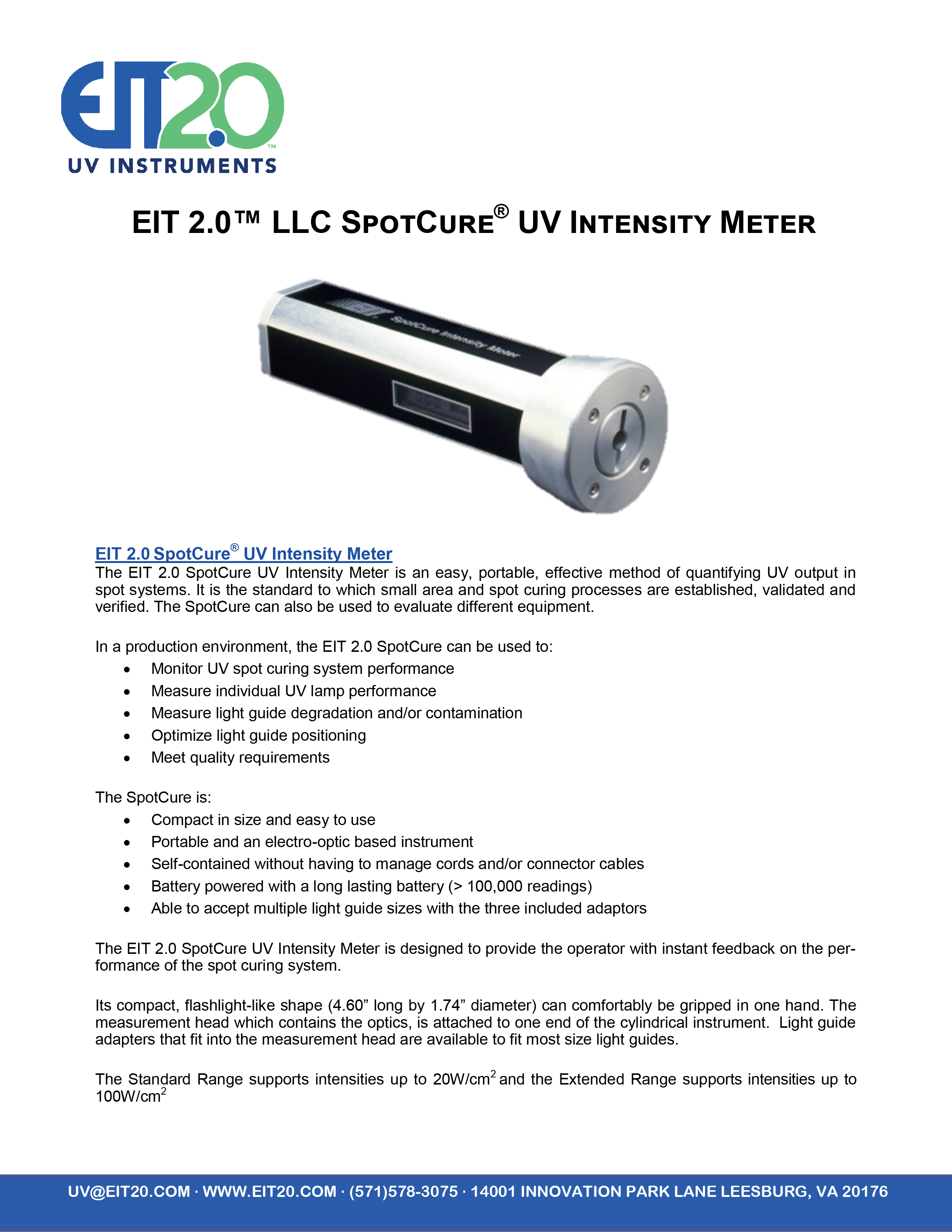 首頁 產品中心 美國 EIT2.0 EIT 2.0TM LLC SPOTCURE®UVINTENSITY METER 25 EIT 2.0TM LLC SPOTCURE®UVINTENSITY METER 1700606